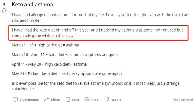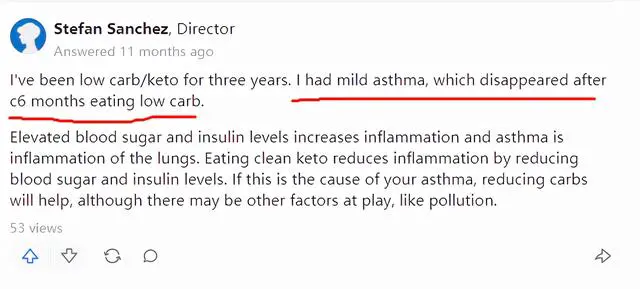 他本人执行低碳生酮饮食已经3年了,低碳生酮6个月的时候,发现自己的哮喘症状已经完全消失了。