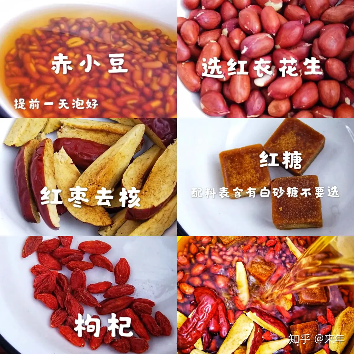 材料:赤小豆,红衣花生,红枣,枸杞,红糖做法:一起放在锅中煮,大概30-40分钟即可,吃五红汤的话,记得食材也要吃完,不能只喝汤。这个粥经常喝,很补气血,而且对脸色发黄的特别友好。