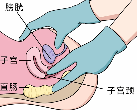 医生戴着无菌手套,右手或左手食中两指蘸润滑剂,顺阴道后壁轻轻插入,另一只手在腹部配合检查。