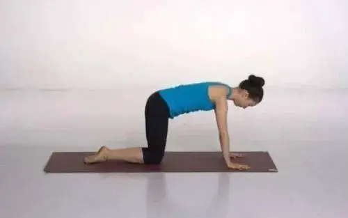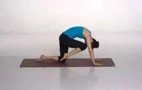 呼气时,屈膝向内收回右腿,同时低头拱背,