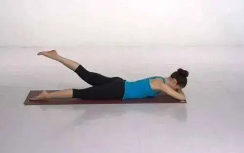 将左腿伸直向上抬起,注意左髋不要离地,