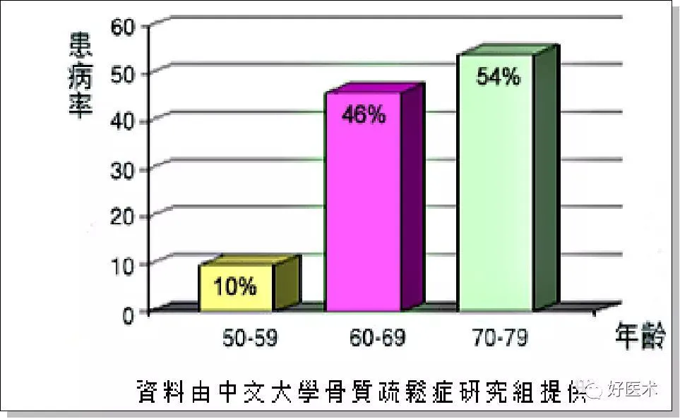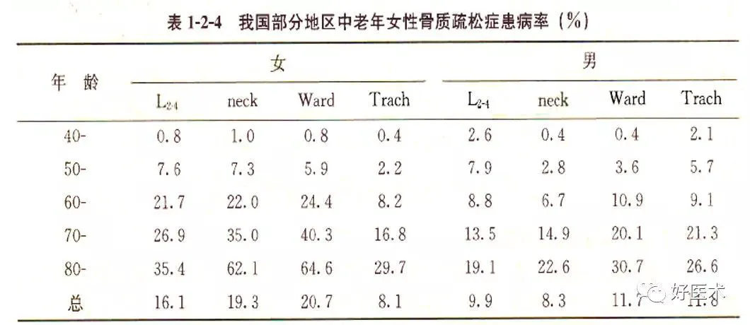 骨矿密度低于健康人骨峰值减2.5个标准差定为骨质疏松症。 骨质疏松症患病率存在种族和地区差异。 60~70岁老人1/3有骨质疏松。 80岁以上1/2有骨质疏松。 亚洲骨质疏松性骨折发生率迅速增加。骨密度流行病学调查