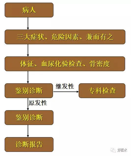种族:骨质疏松症危险白种人、亚洲人高于黑人 性别:骨质疏松症老年女性比男性更常见 年龄:骨质疏松症风险随增龄而增加 低体重和低BMI:身材瘦弱者骨量低,易患骨质疏松症 家族史:父母有髋骨骨折史,子女发生骨折的危险增加 营养:钙摄入不足或钙吸收障碍 性激素低下、早绝经:雌激素缺乏致骨质疏松症 生活方式:吸烟、过多饮酒、过多饮用咖啡及碳酸饮料 缺乏体力活动和身体锻炼:久卧久坐骨质疏松症危险性高 影响钙代谢的疾病和药物:糖皮质激素、利尿剂等骨质疏松的诊断流程