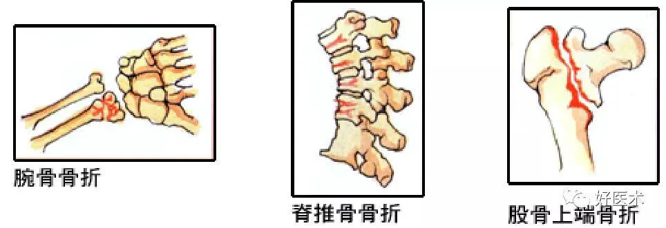 隐匿性:沉默杀手,常被误为骨质增生、椎间盘突出、颈椎病、关节炎。 身心病痛:多发性全身性疼痛、身材变矮/变形影响呼吸消化功能、骨折。 低生活质量:活动受限、社会功能降低、依赖他人、自信心减低、抑郁。 高额医疗费用:手术、器材、材料、药物,护理、防治。 高致残率:骨折后并发症(肺栓塞、肺炎),1年内死亡率10%~20%。 高病死率:老年骨折加重心脑血管并发症,1年内死亡率10%~20%。骨质疏松常见骨折
