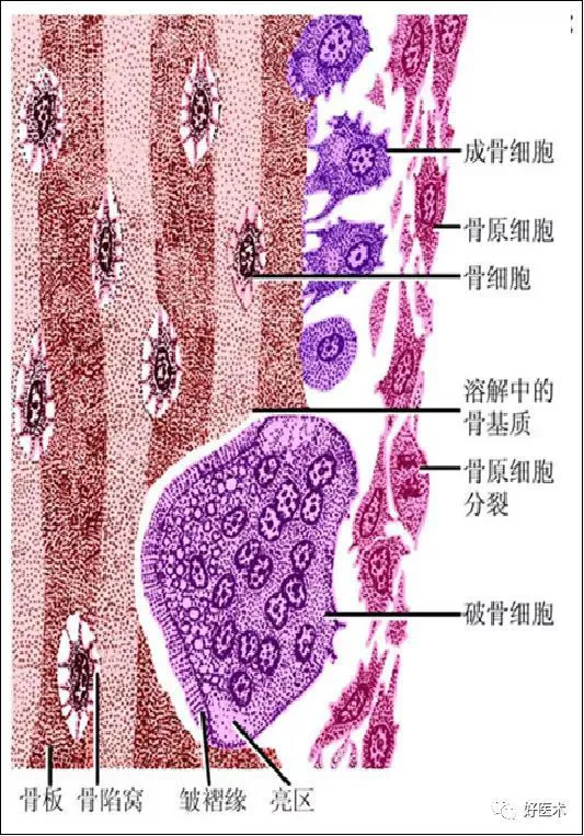 成骨细胞合成分泌类骨质,矿化形成新的骨基质予以填补。