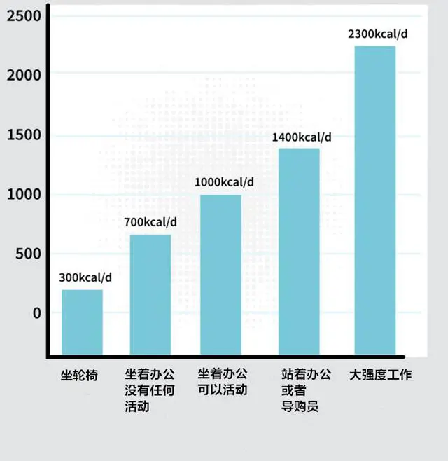 上图来自一项观察职业强度对能量消耗影响的研究[11]。大家可以看到,即使都是坐着办公,能够活动和不能够活动都会有300kcal的能量差异。