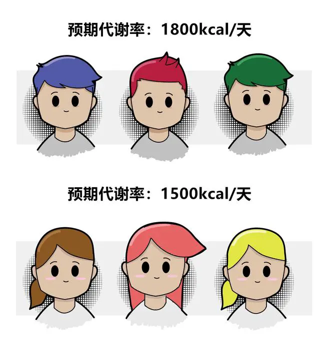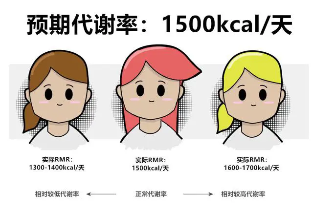为了帮助大家量化这个差异,我们就假设找了一群考虑到年龄、性别和身体成分的男性和女性。经过计算,男性的预期RMR是每天1800kcal,女性的预期RMR是每天1500kcal。