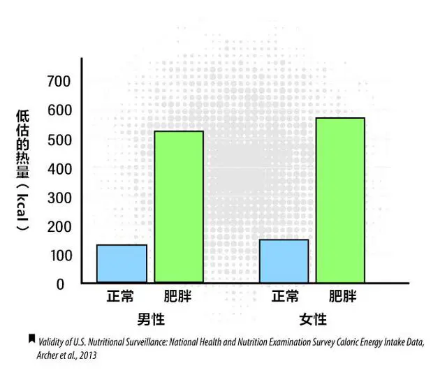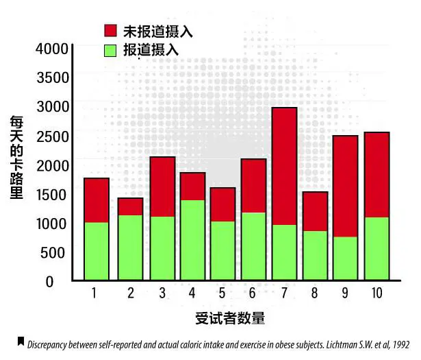 此外,还有研究人员观察了那些声称每天吃少于1200kcal热量但是瘦不下来的人。受试者会在研究前进行测试,以确保他们没有代谢异常。受试者的平均自我报告摄入是1028kcal,但实际的平均摄入是2081kcal,他们低估了将近一半的摄入量!