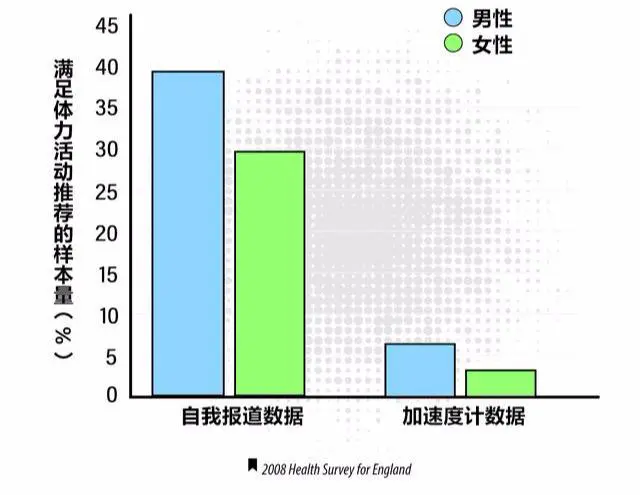 2008年英格兰健康调查要求成年人回忆他们在过去4周里进行了多少体育活动。自我报道数据表明,40%的男性和30%的女性满足了体力活动的最低推荐。但是仪器(加速度计)测量数据表明,只有6%的男性和4%的女性满足了推荐的活动水平。