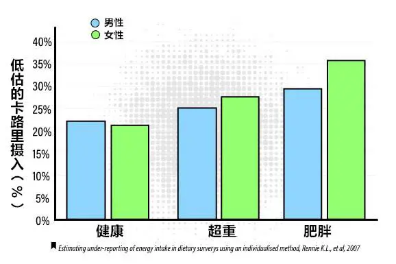 不仅普通人如此,连营养学家都会低估热量的摄入。相关数据表明,营养学家每天会平均低估223kcal,非营养学家每天会平均低估429kcal[6]。因此,虽然营养学家改善了自我报告食物的准确性,但是也无法完全消除这个现象。网上有太多人认为自己的代谢低瘦不下来,但实际上是因为低估了热量摄入。