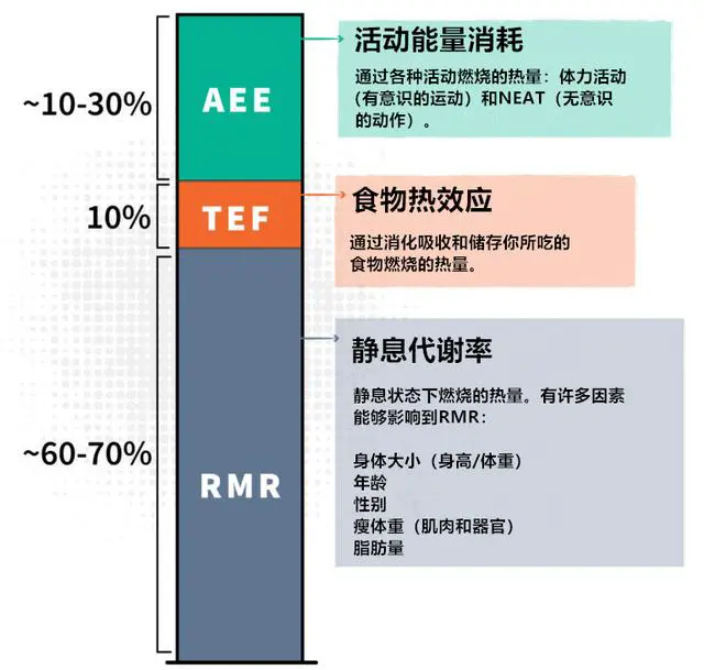 我提到的这些所有过程都会消耗卡路里,这些消耗的卡路里加起来就称为静息代谢率(RMR)。在大多数人中,RMR占了代谢的大部分,大约占能量消耗的60-70%。