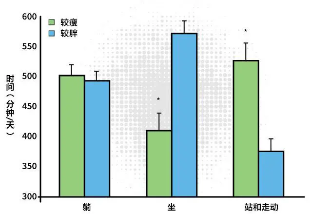 比如,Levine等人发现,尽管较瘦的人和较胖的人都属于“久坐人群”,但是较胖的人坐的时间更多,站的时间更少[9]。