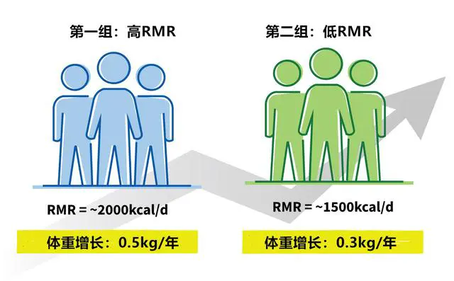 研究人员观察了平均10年的体重增长,结果发现尽管两组之间有500kcal的RMR差异,但是体重增长率并没有显著差异。