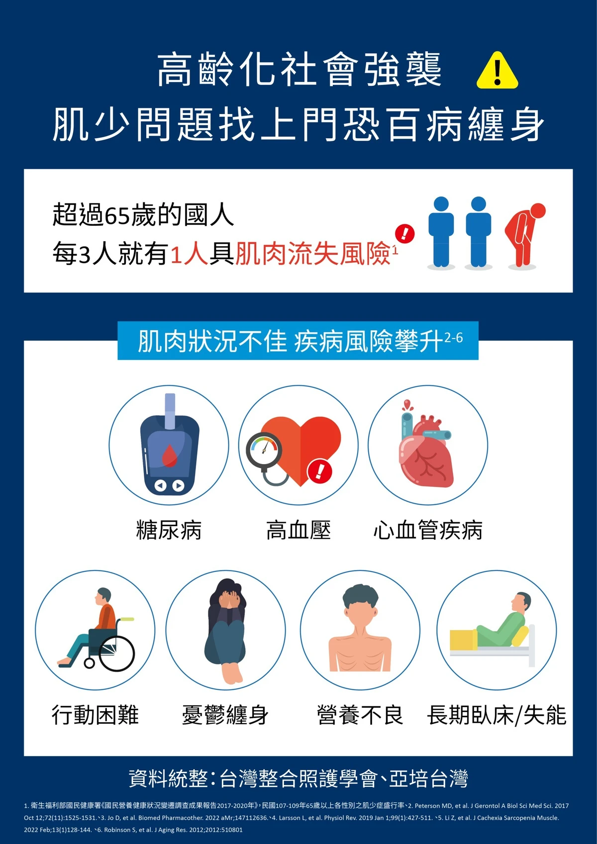 隨著生活型態改變,現代人肌肉流失加劇,愈來愈多研究指出肌肉量對於健康的影響,不僅是高齡者,甚至年輕人體力與肌力都有急速下滑的趨勢,高齡患者甚至有可能引起失能或長期臥床7.4年。