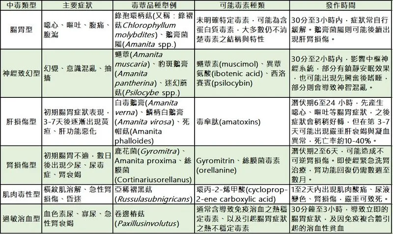 毒蕈的有毒成分十分複雜,且所含毒素種類通常不只一種。毒素除了存在於特定蕈類品種之外,還可能因生長環境、時間、季節等外在因素,而出現毒素種類以及含量上的變化。主要的毒素類型,依影響的器官系統可大致分為腸胃型、神經致幻型、肝損傷型、腎損傷型、肌肉毒性型及過敏溶血型等,由於毒蕈毒素通常無法經加熱烹煮去除,因此一旦食入,極有可能產生程度不一的毒性危害。以下就較重要的中毒類型、毒蕈品種、可能毒素種類以及發作時間簡要說明如下: