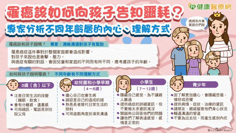 罹患癌症這件事對於整個家庭都會造成影響,對孩子來說也是衝擊、壓力,但不同年齡層的孩子對於生病、癌症甚至死亡的理解與認知有些不同,該如何用正確的方式告訴孩子自己罹癌的消息呢?