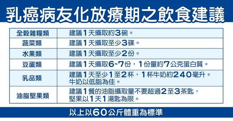 「化放療時期」是化療期間,可能會造成白血球數目下降,因此要注重蛋白質的攝取,以60公斤的成人為例,每天建議攝取約6-7份豆蛋類加1-2份奶類,其中以原型的豆類製品與低脂牛奶為佳。
