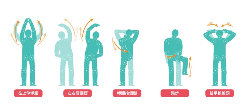今年國健署便與運動網紅合作,推出「5動5健康」示範影片,希望長者透過以下5款簡單的動作,持續增進肌力、平衡力等,以達到延緩失能、減少跌倒的效果: