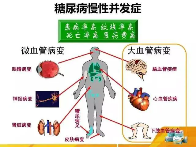 长期血糖增高,大血管、微血管受损并危及心、脑、肾、周围神经、眼睛、足等。据世界卫生组织统计,糖尿病并发症高达100多种,是目前已知并发症最多的一种疾病。