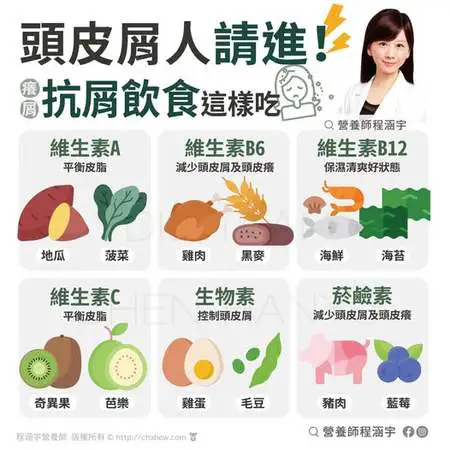 除了外部的清潔保養,透過飲食調整也有助於改善頭皮屑問題!程涵宇營養師列出6大營養素,幫助大家由內而外調理,維持健康清爽的頭皮。