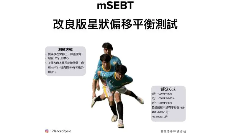 該測試用於評估下肢的動態姿勢控制缺陷,特別是慢性腳踝不穩定患者。患者赤腳站在「Y」形中心,必須用另一條腿在3個方向上盡可能地伸展:向前(ANT)、後內側(PM)和後外側(PL),然後回到原始位置。