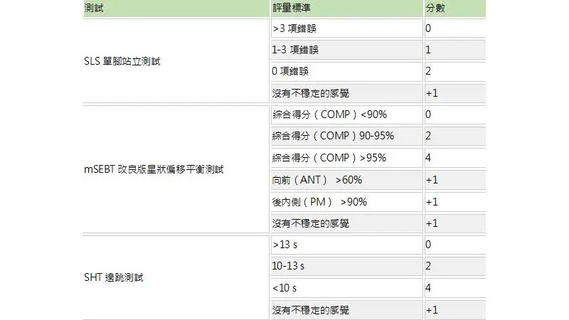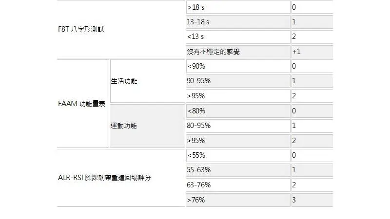 為了預測復原的程度,國外學者發展出了「Ankle-GO」量表,綜合過去許多回場運動的工具,可用於評估能否回場運動。如果量表分數小於8分,很難在4個月內回到原來的運動水準。
