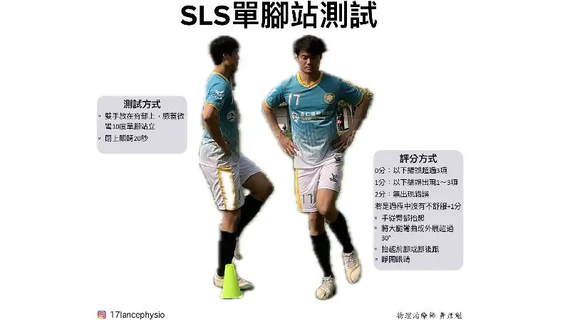 受試者單腳赤腳站立,膝蓋微彎10度,雙手放在臀部上,閉上眼睛20秒。此測試根據參與者的錯誤數量,評估靜態姿勢控制。記錄以下任何一項錯誤:將手從臀部抬起、將大腿彎曲或外展超過30度、抬起前腳或腳後跟、保持不動離開測試位置超過5秒,或睜開眼睛。練習者計算並累積每條腿的錯誤數量。2次學習課程後,每隻腳進行一次測試。