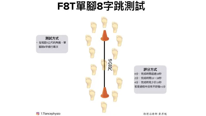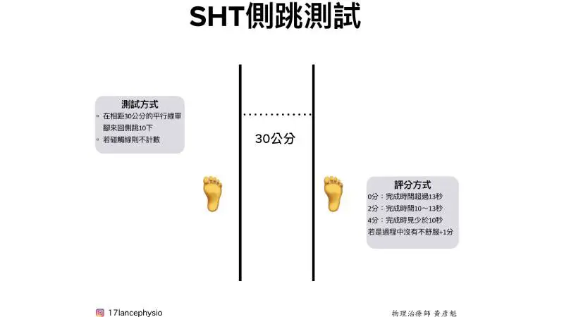 此測試涉及在相距30公分的2條線之間,以盡可能快的速度橫向和向內跳躍10次。第一次跳躍始終朝向外側。如果患者觸摸該線,則該來回跳躍不計算在內。