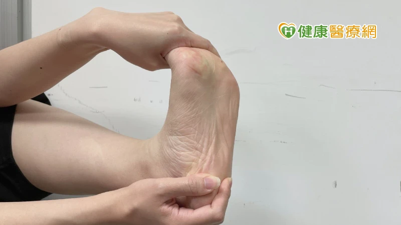 翹腳把腳板放在膝蓋上,接下來用手把腳趾頭搬向極限,感受一下足底筋膜是有緊繃感。大拇指來回按摩腳底30下。