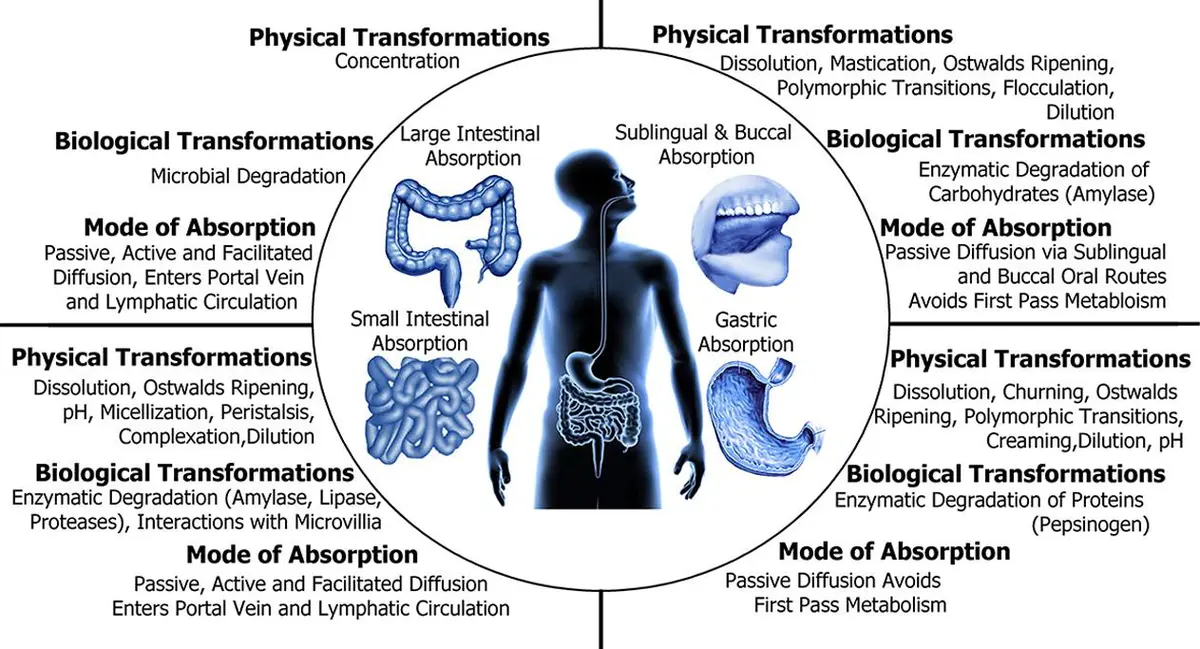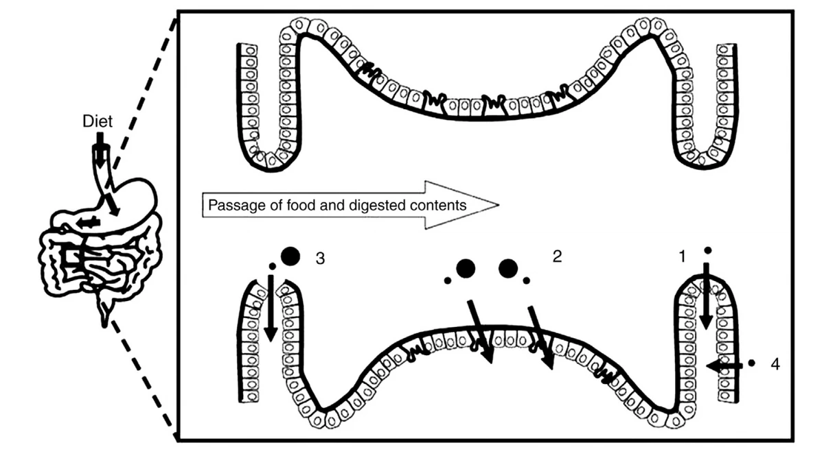 谈到吸收,就不能不谈生物利用度。生物利用度实际上就是指有多少比例的被消化物质到达了血循环。另一方面,肠道吸收度是指有多少比例的被消化物质穿过了肠道上皮。不难看出,穿过肠道的营养素并不是完全入血的,因为在此之前还有多个路径。食物有效成分的主要吸收部位是小肠,但是,被动吸收可能发生在消化道的其他部位,这取决于纳米载体及活性成分的特性。除了吸收部位外,吸收部位传递系统的状态,有效成分的生物特性也是决定吸收方式的重要因素。不同传递系统所含的有效成分是通过不同的通路吸收的。同样道理看,亲水性和亲脂性营养素的吸收通路也不同,前者通过门静脉传送,而后者则通过淋巴系统后再入血循环。这些参数决定了营养素吸收的速度和程度。纳米颗粒到达吸收部位时,它们需要穿过上皮的黏液层及上皮细胞才能到达血循环。营养素吸收可按是否需要能量分为主动运输和被动运输。主动运输需要利用上皮细胞的能量,以使有效成分通过特定通道穿过上皮细胞。与主动运输不同,被动运输不需要借助细胞能量,营养素是通过简单扩散过程穿过上皮细胞。