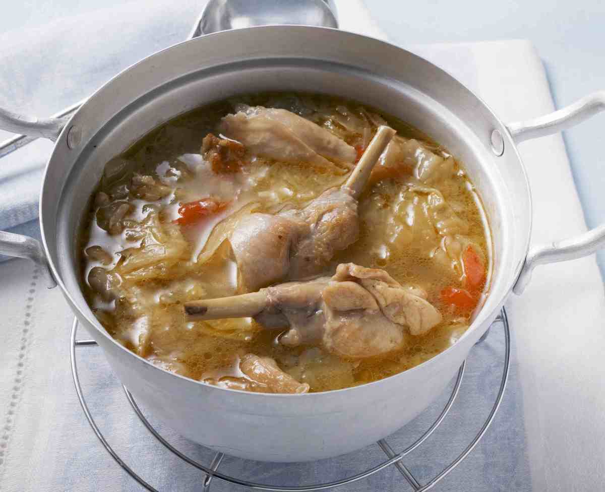 - 02食用时,将鸡腿和脯肉去骨,片成片,扣入碗内,带少许骨垫底,翻扑盘内。