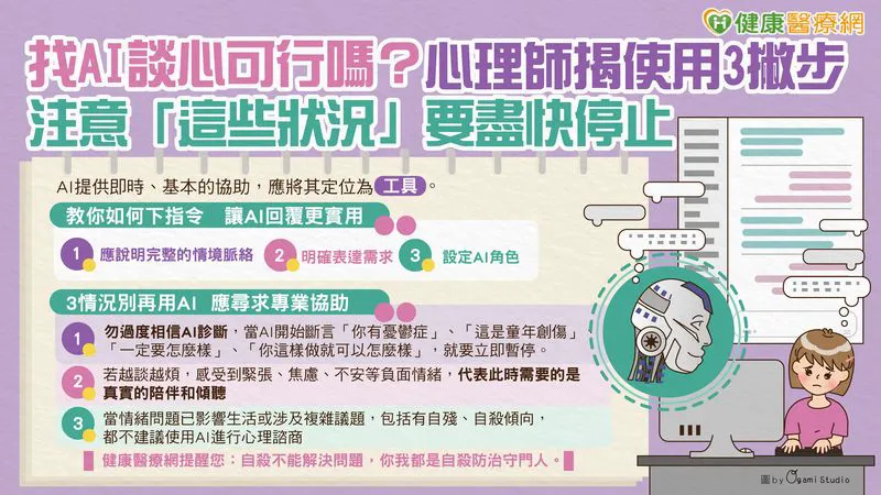 想跟AI聊心,蘇琮祺心理師建議,最簡單的做法是直接問AI:「我現在有情緒困擾,如果要跟你對談,需要問什麼問題?」以及「你的回覆內容,我要注意的地方有哪些?」